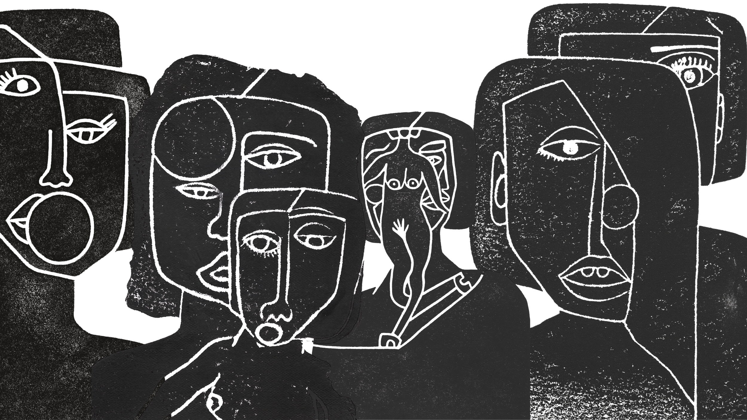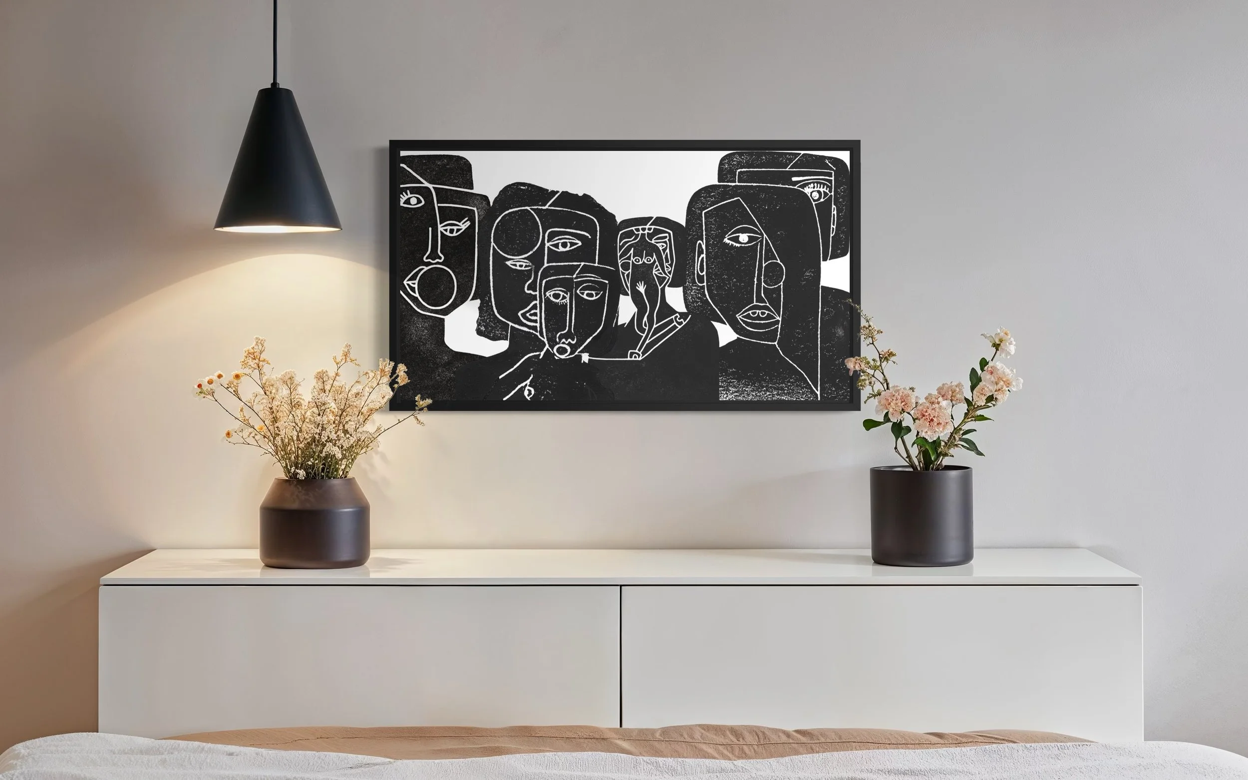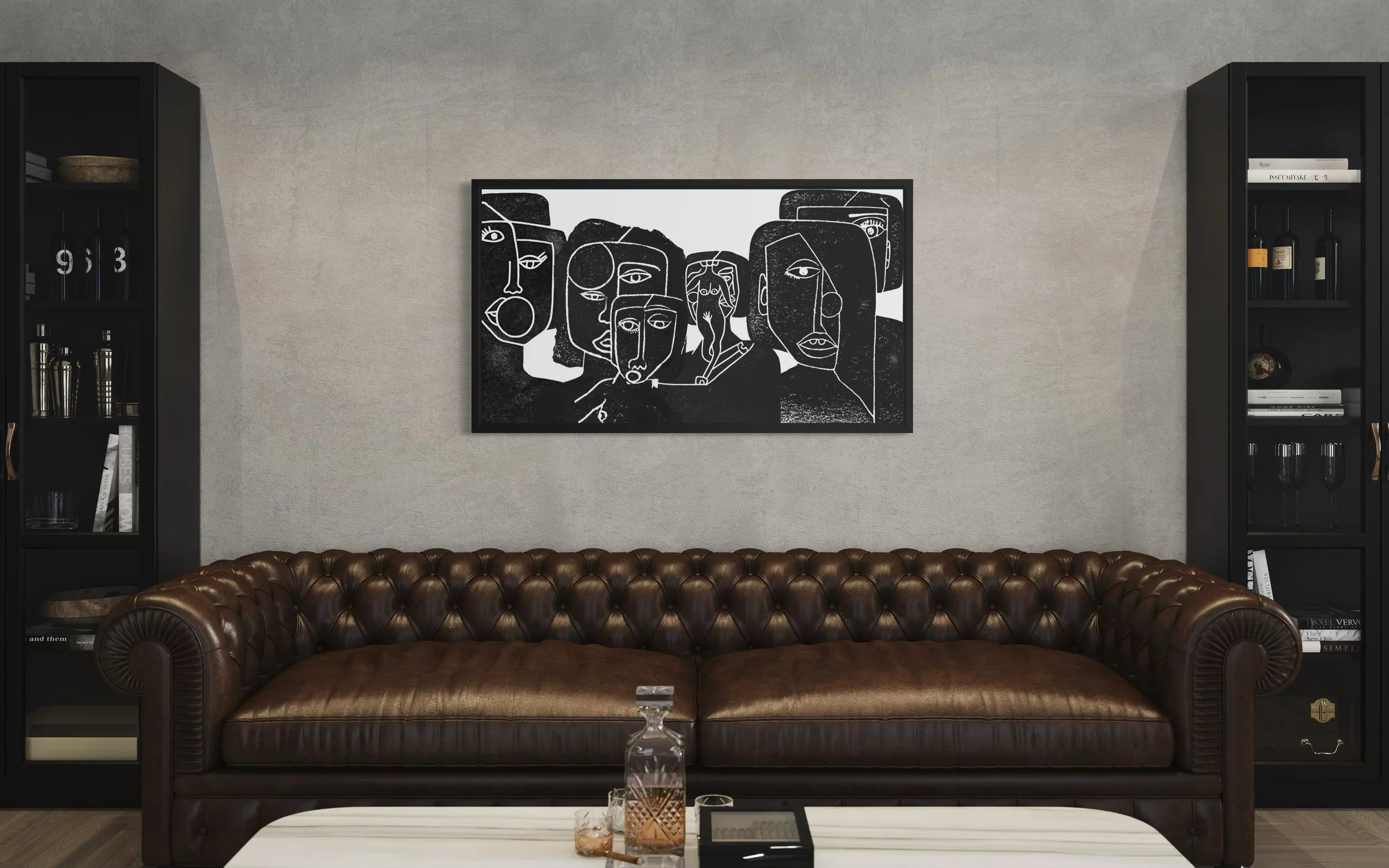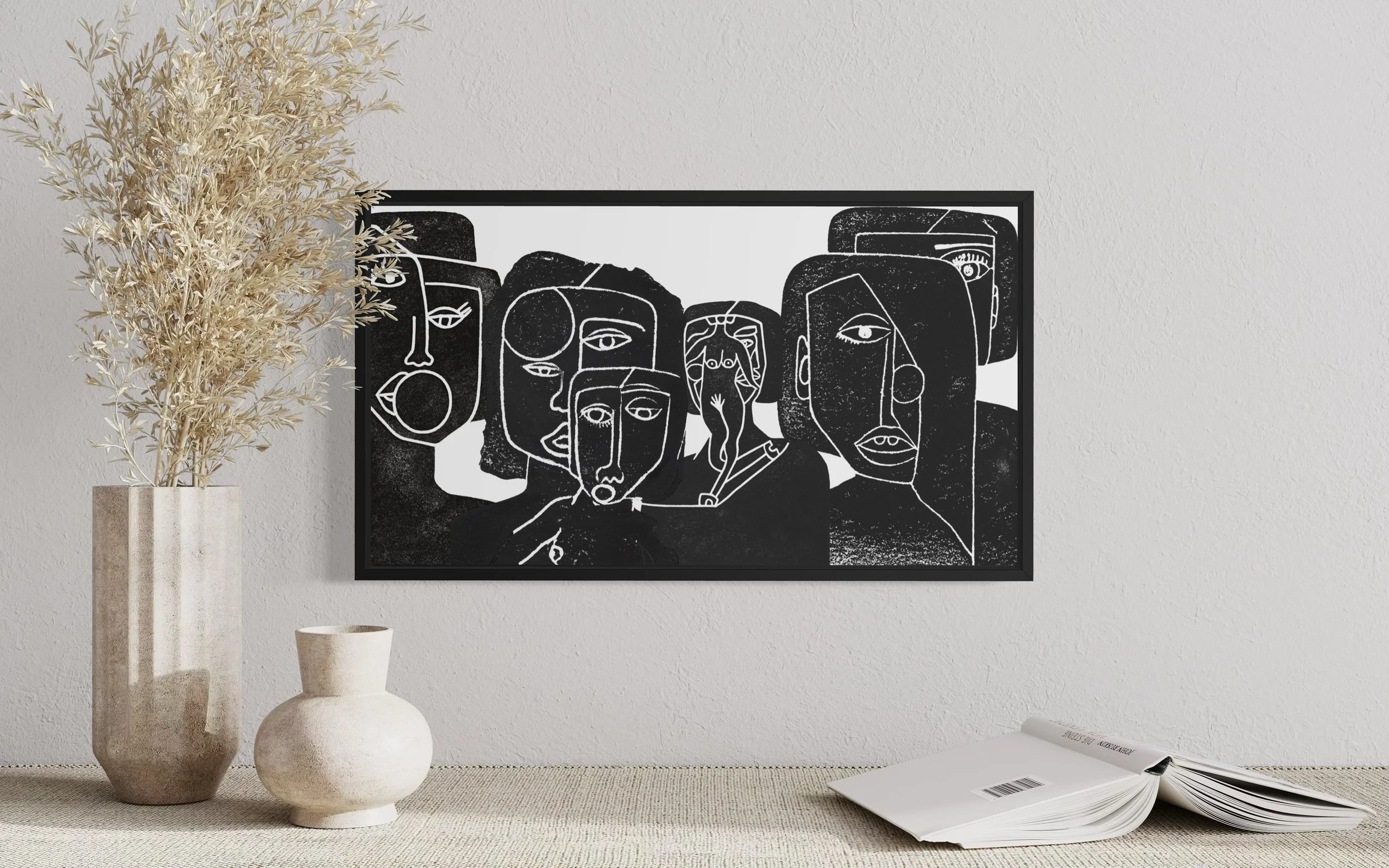 A collection of original relief prints created through drawings incised into foam board, inked, and pressed by hand. Each piece carries the raw immediacy of the process — faces emerging in stark contrast, shaped by pressure, intuition, and memory.