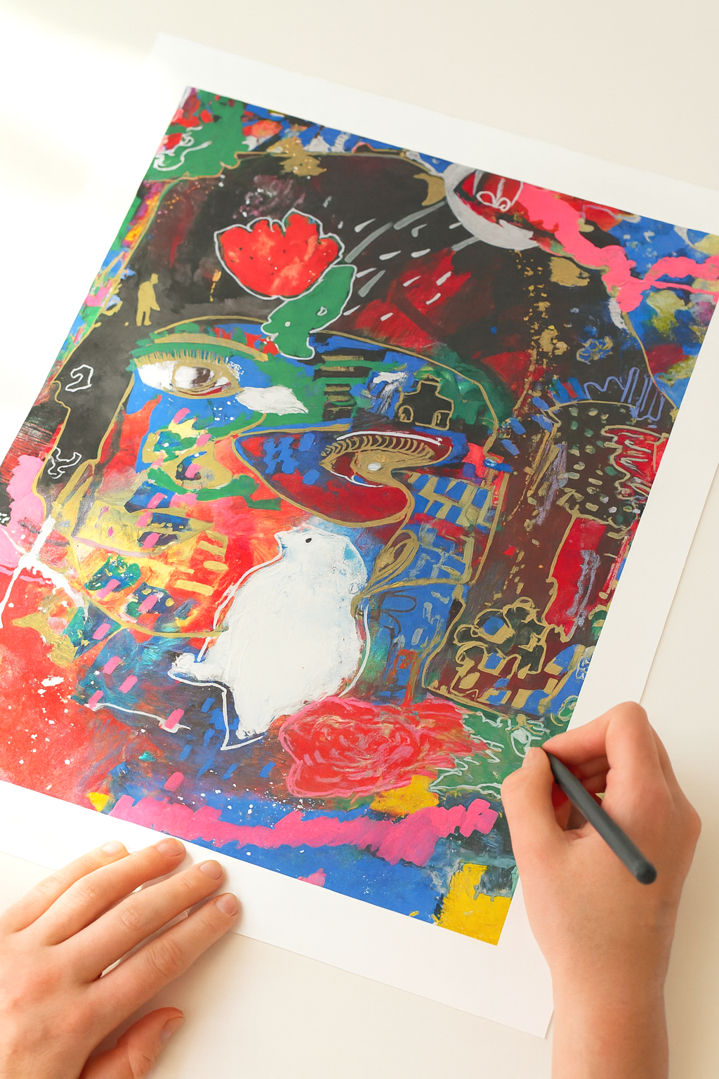 Created through relief printmaking — drawings incised into foam board, inked with a roller, and pressed onto heavyweight paper — the process carries a stark honesty. Faces emerge in ink, fragile yet bold, revealing both pressure and tenderness.